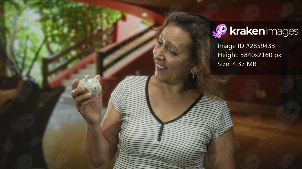 Middle aged hispanic woman smiling holds ceramic piggy bank with bare hand in building; savings optimism.