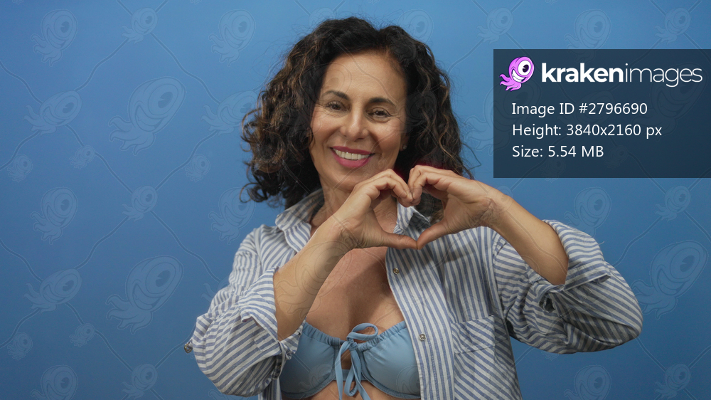 Middle-aged hispanic woman smiling in bikini with striped shirt against isolated blue background forming heart with hands.