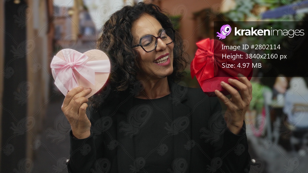 Middle-aged hispanic woman smiling outdoors holding two heart-shaped gift boxes with bows on a lively street.