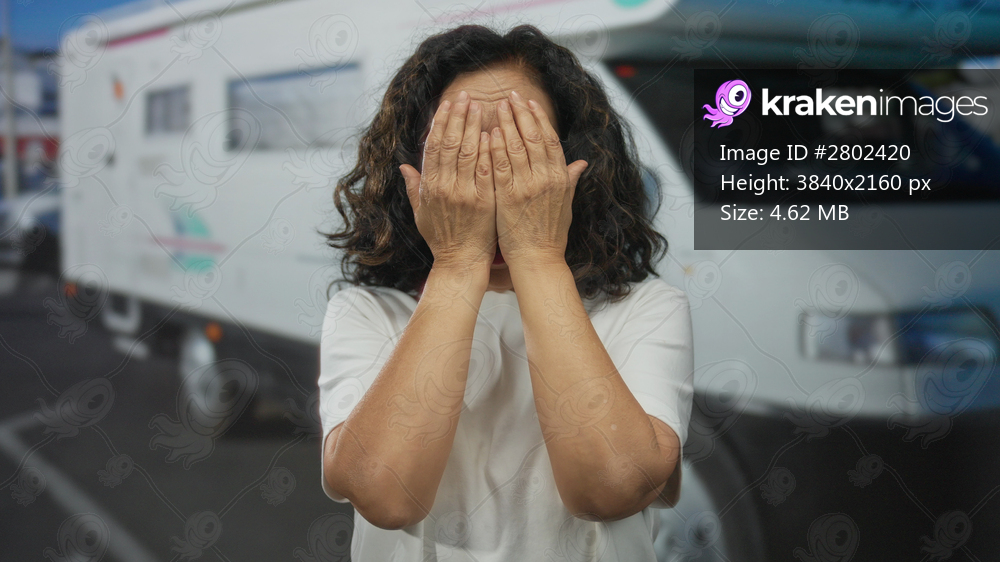 Middle-aged hispanic woman smiling outdoors in front of a camper van, enjoying a sunny day on the street.