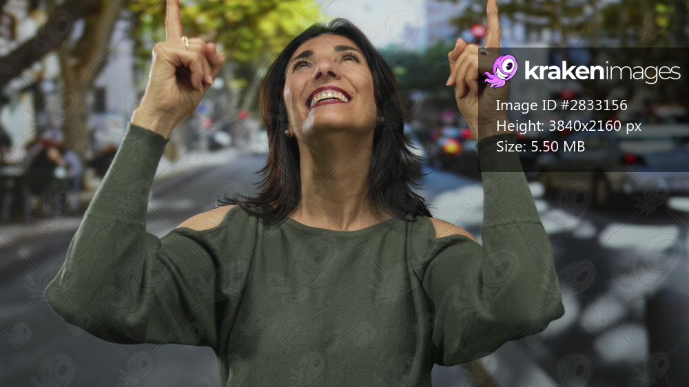 Middle aged hispanic woman smiling points fingers upward on sunlit busy urban street; hope optimism.