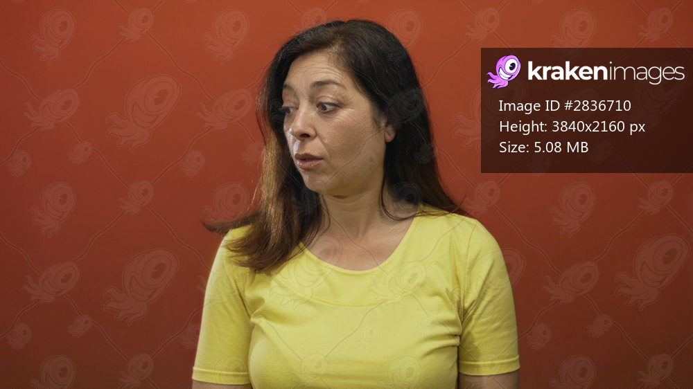 Middle aged hispanic woman spreads hands, shrugs and opens mouth in studio against an orange wall; surprise.