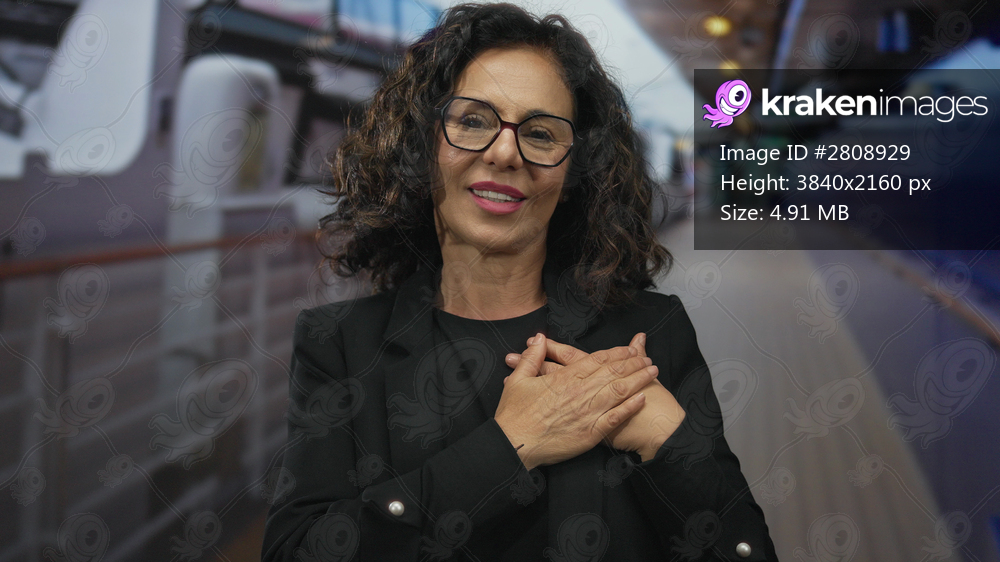 Middle-aged hispanic woman standing on a boat deck with a sea view, hands over heart, expressing gratitude outdoors, wearing glasses and black jacket, relaxed and serene atmosphere. - Kraken Images