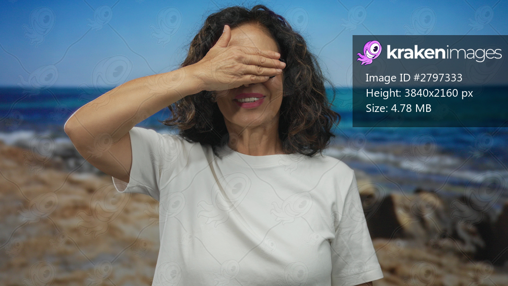 Middle-aged hispanic woman stands smiling at seaside beach with blue ocean backdrop on a sunny day.