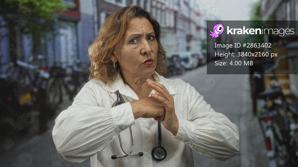 Middle aged hispanic woman with stethoscope making fist to palm fighting gesture on a city street; defiance protection.
