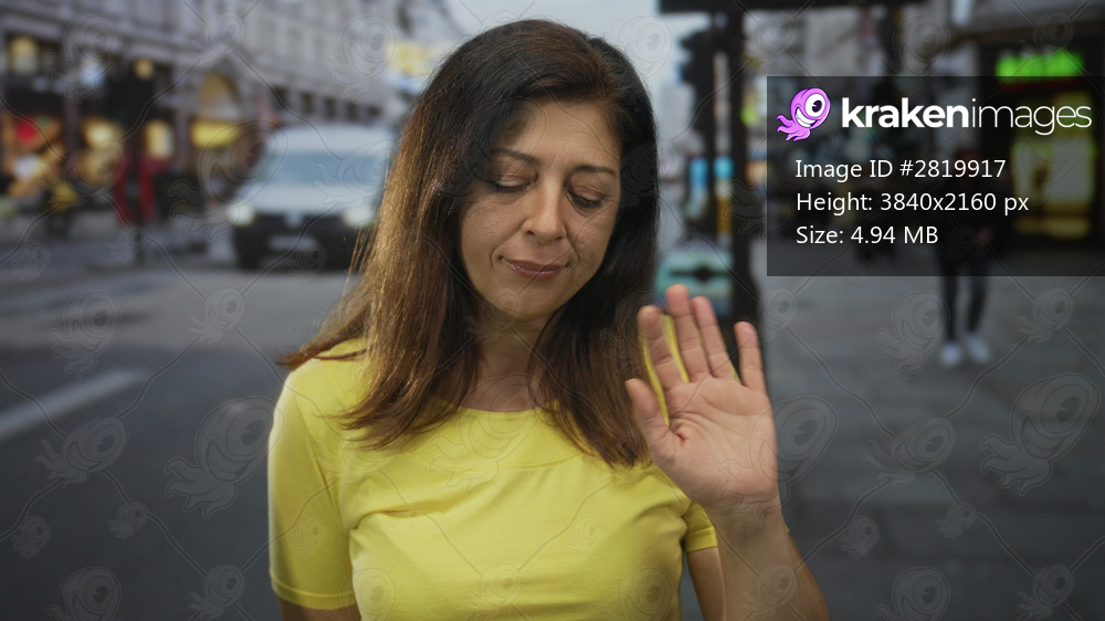 Middle aged hispanic woman waves hand amidst a bustling crowd of pedestrians on a city street; friendly greeting.