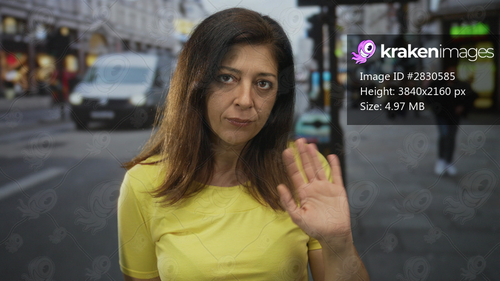 Middle aged hispanic woman waves hand amidst a bustling crowd of pedestrians on a city street; friendly greeting.