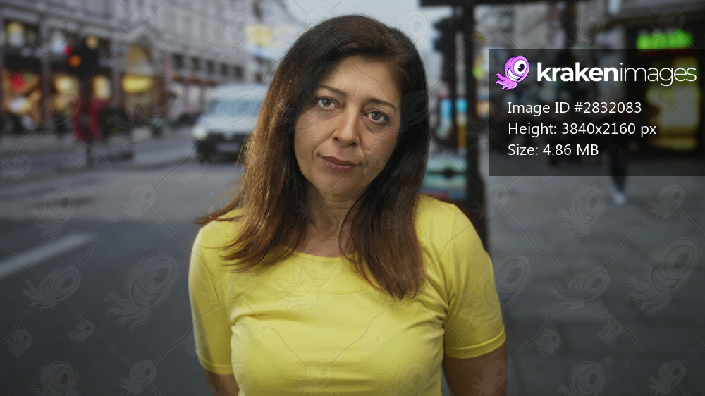 Middle aged hispanic woman waves hand amidst a bustling crowd of pedestrians on a city street; friendly greeting.
