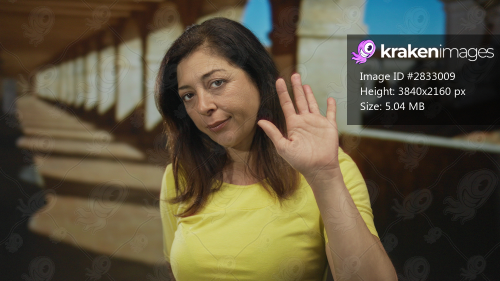 Middle aged hispanic woman waves hand at sunlit university colonnade in yellow shirt, standing along historic stone walkway; greeting warmth.