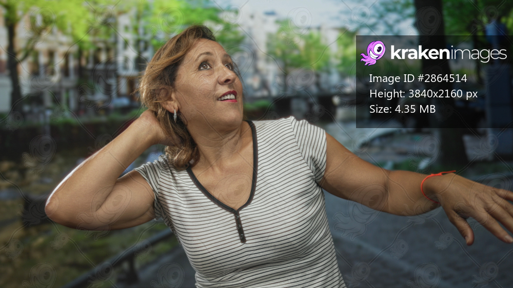 Middle aged hispanic woman waving hands on bright sunlit canal street by a tree lined waterway; pure joy.