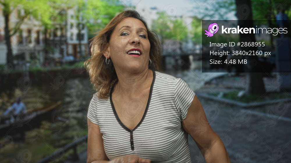 Middle aged hispanic woman waving hands on bright sunlit canal street by a tree lined waterway; pure joy.