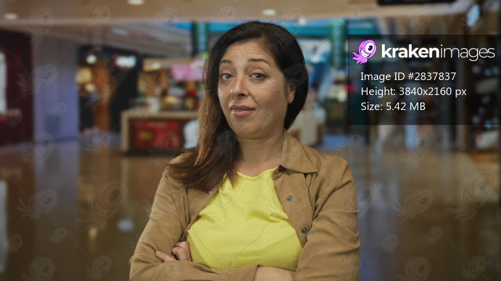 Middle aged hispanic woman wearing brown jacket and yellow shirt stands with arms crossed in central area of a shopping mall building; rejection.