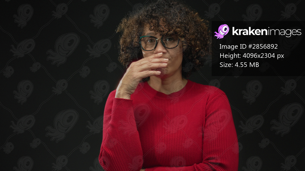 Middle aged hispanic woman wearing glasses and a red sweater pressing her hand to her forehead in a studio; anxiety.