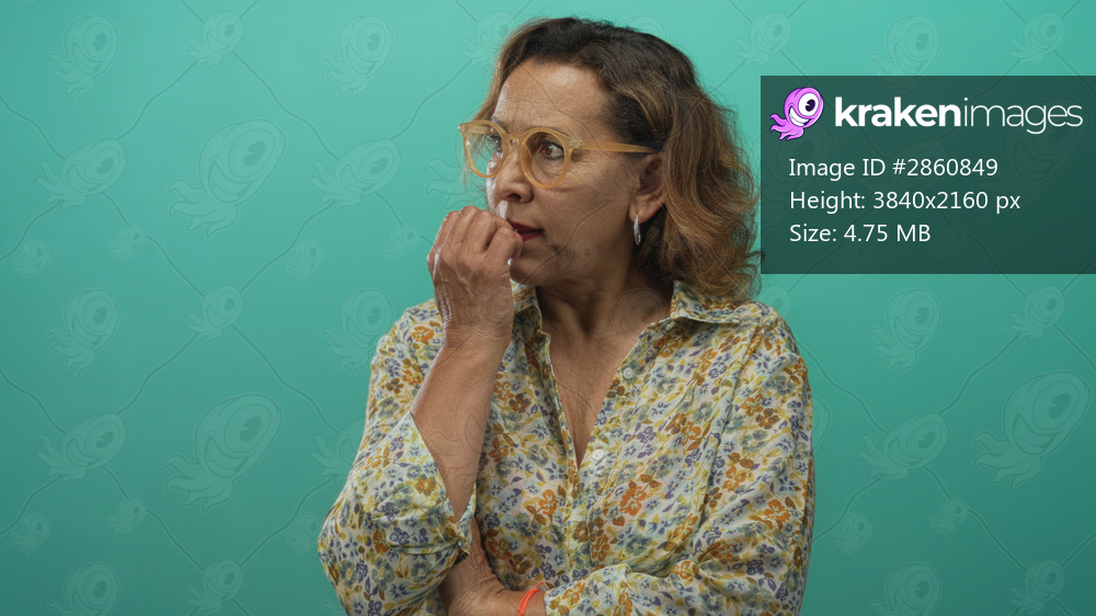 Middle aged hispanic woman wearing glasses biting finger gesture while looking aside in studio setting; anxiety.