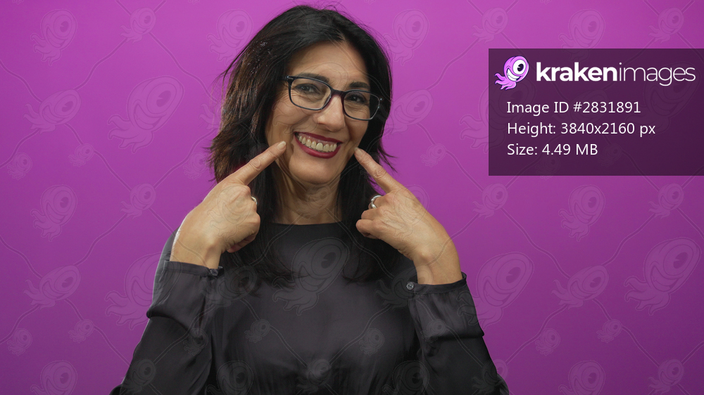 Middle aged hispanic woman wearing glasses and black blouse points index fingers to lips in purple studio; joy.