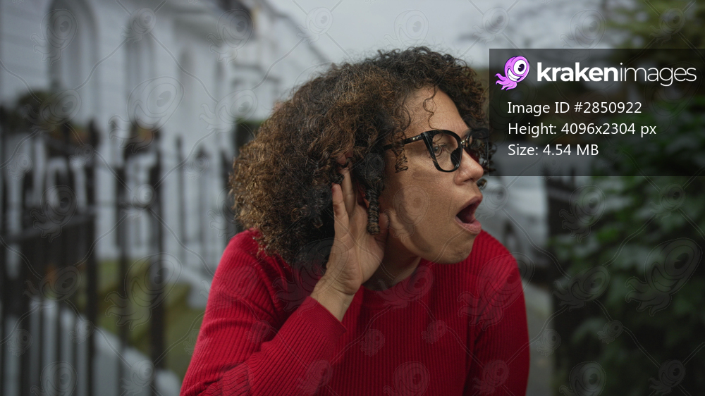Middle aged hispanic woman wearing glasses cups hand to ear on street next to white building facade; curiosity.