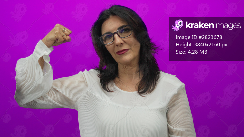 Middle aged hispanic woman wearing glasses firmly raises fist and flexes arm in purple studio; confidence.
