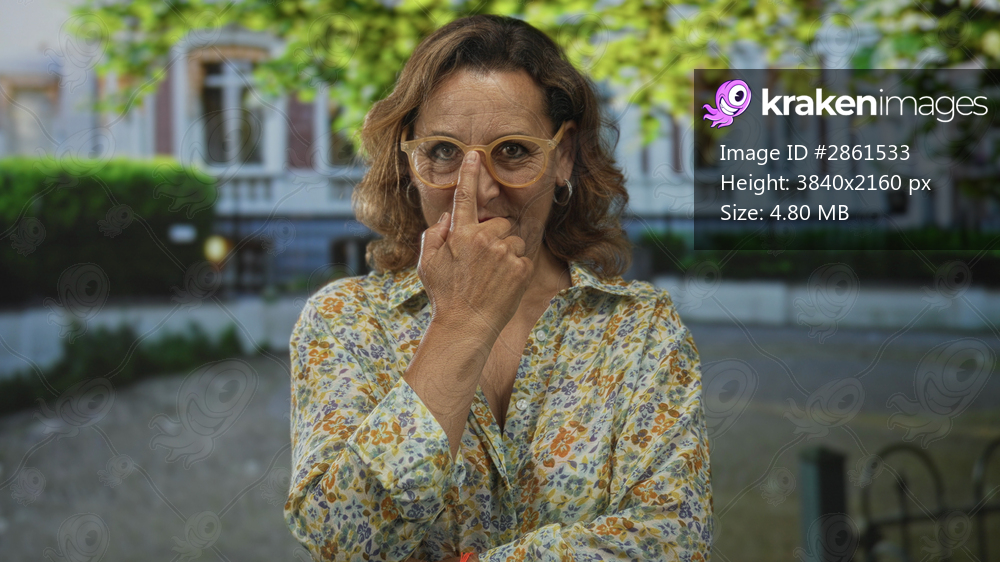 Middle aged hispanic woman wearing glasses and floral blouse touching chin on urban street outdoors; confidence.