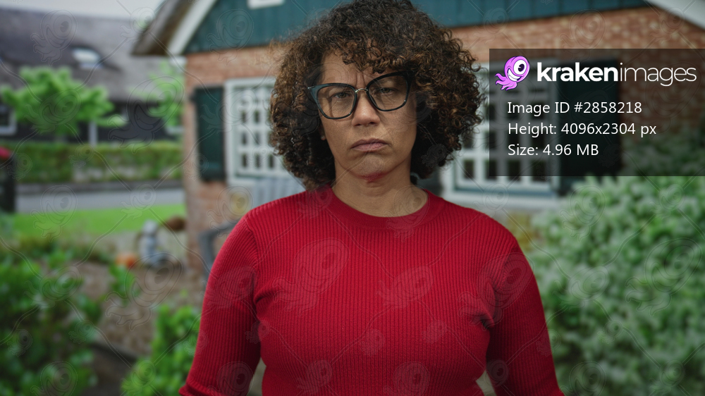 Middle aged hispanic woman wearing glasses frowning with visible neck at building entrance; quiet frustration.