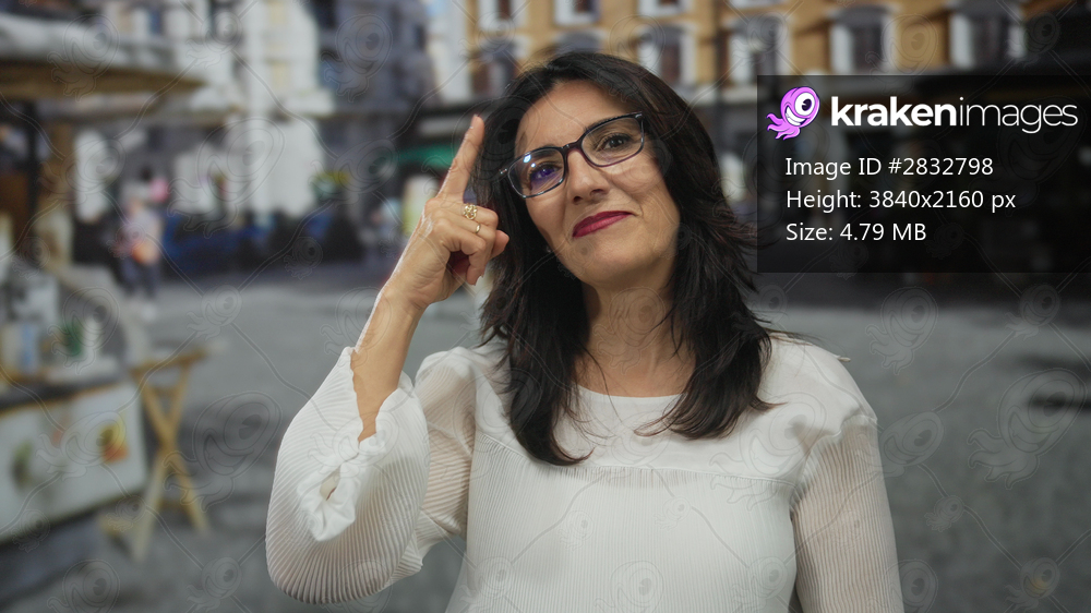 Middle aged hispanic woman wearing glasses and white blouse points finger to temple on busy city street; thoughtful contemplation.