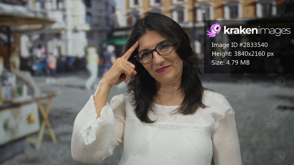 Middle aged hispanic woman wearing glasses and white blouse points finger to temple on busy city street; thoughtful contemplation.