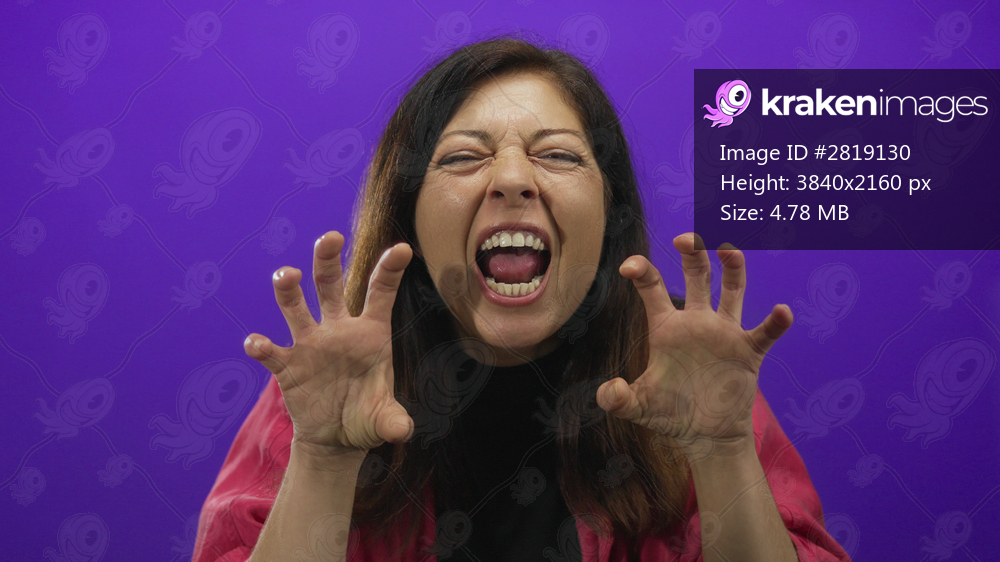Middle aged hispanic woman wearing pink jacket with claw hands and bared teeth in purple studio; ferocity.