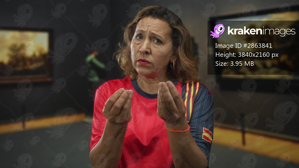Middle aged hispanic woman wearing red spanish tshirt gestures with bare hands in gallery building; confusion.