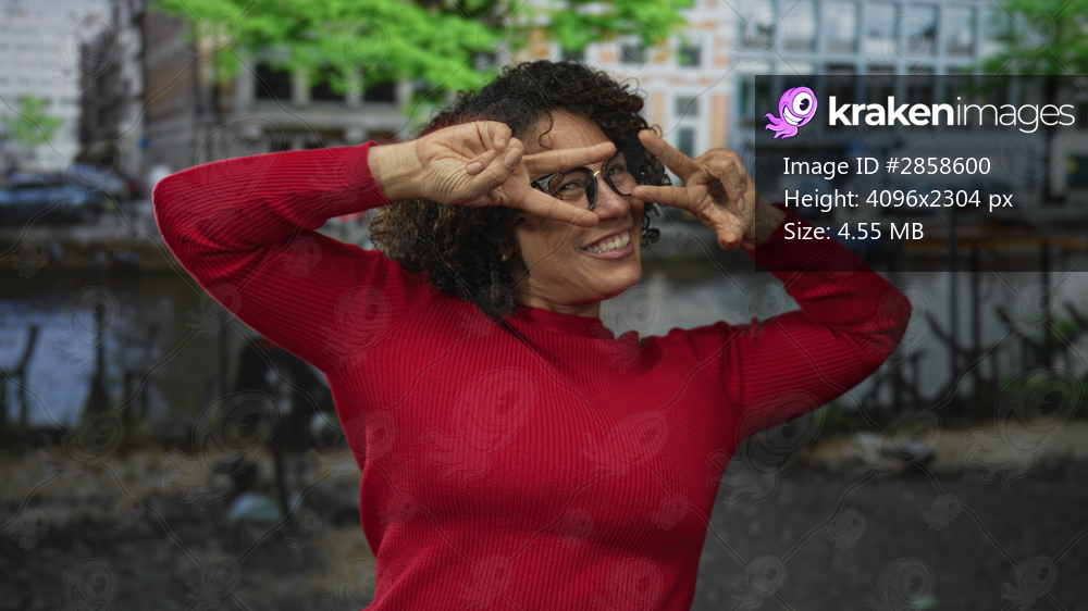 Middle aged hispanic woman wearing red sweater and glasses points finger to camera on street by canal in amsterdam; playfulness.