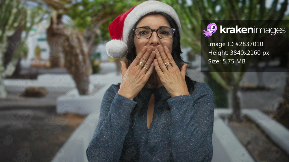 Middle aged hispanic woman wearing santa hat blowing kiss with hands near lips on street; holiday joy.