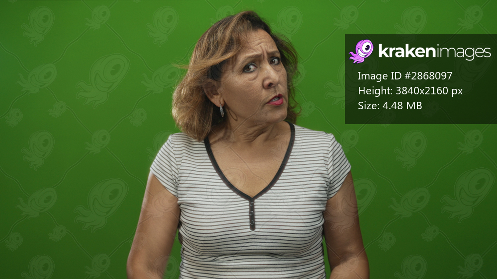 Middle aged hispanic woman wearing striped shirt and hoop earrings furrows brow and tilts head in studio; confusion.