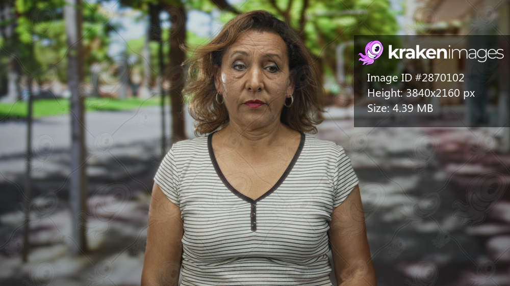 Middle aged hispanic woman wearing striped shirt pressing hand to forehead on sunlit city street; exhaustion.