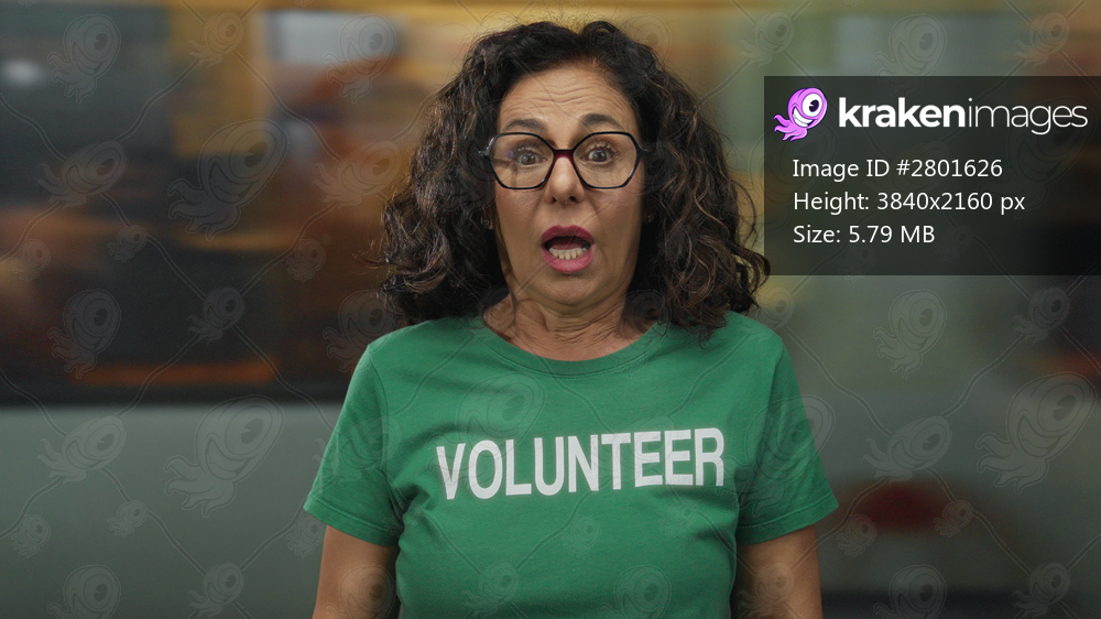 Middle aged hispanic woman wearing volunteer uniform touches chin nervously in train station; disgust unease.