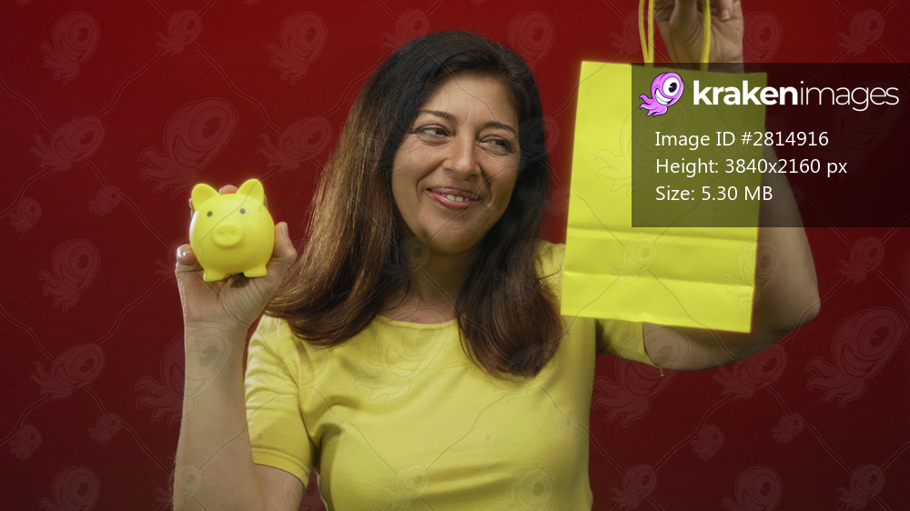 Middle aged hispanic woman wearing yellow shirt holds piggy bank and paper bag against red studio wall; savings planning optimism.