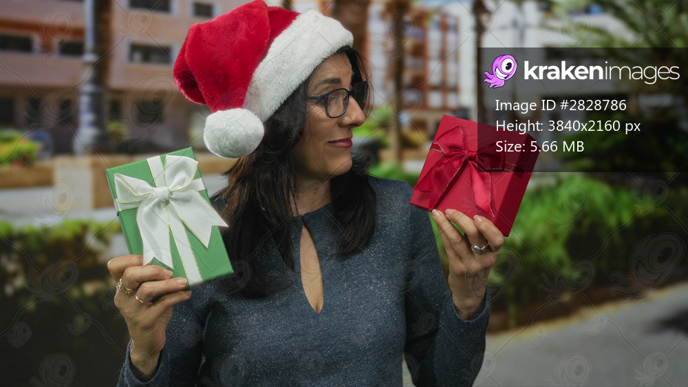 Middle aged hispanic woman wears eyeglasses santa hat and holds red and green gift boxes in park under palm trees; holiday choice joy.