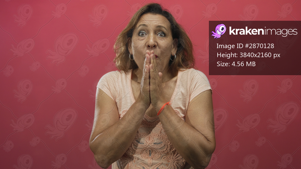 Middle aged hispanic woman with wide eyes covering mouth with hands in red studio; surprise reaction astonishment.