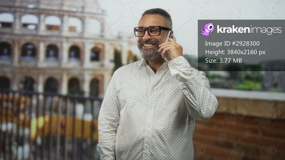 Middle aged man with beard and glasses smiling while holding phone to ear at building coliseum; joy travel connection.