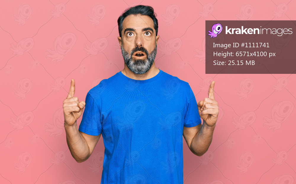Middle aged man with beard wearing casual blue t shirt amazed and surprised looking up and pointing with fingers and raised arms.
