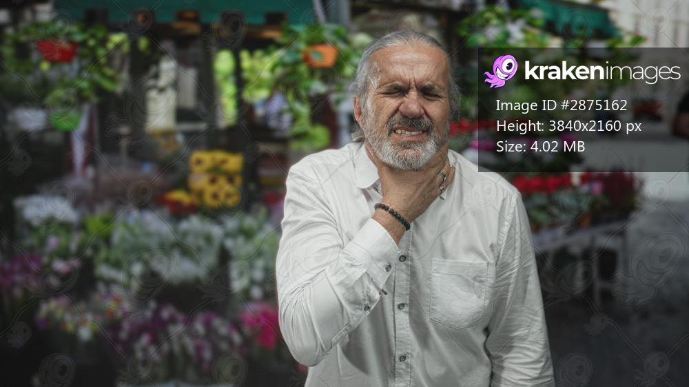 Middle aged man clutching throat with hand beside a flower stall on a busy street; distress discomfort.