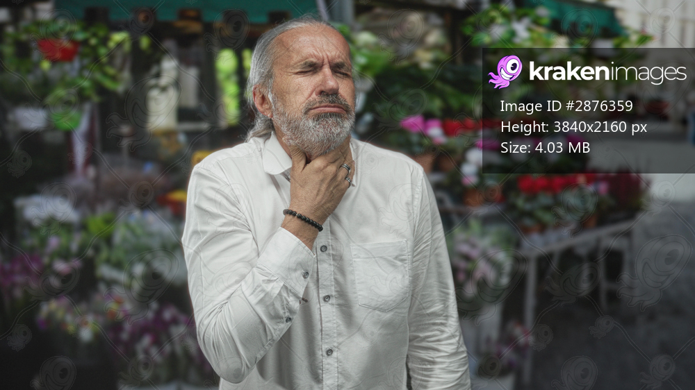 Middle aged man clutching throat with hand beside a flower stall on a busy street; distress discomfort.