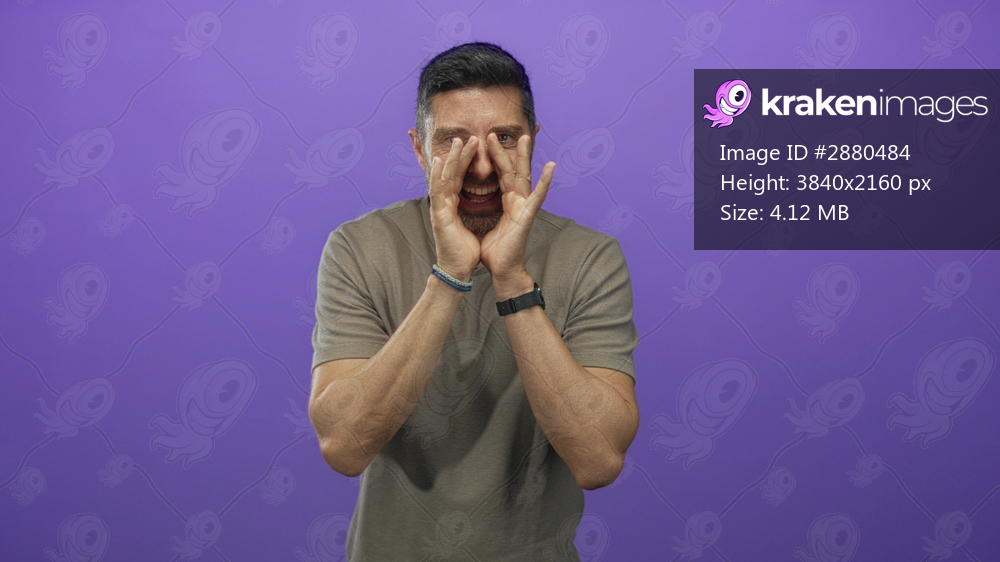 Middle aged man cupping hands to mouth shouting toward camera in studio against purple wall; urgent announcement.