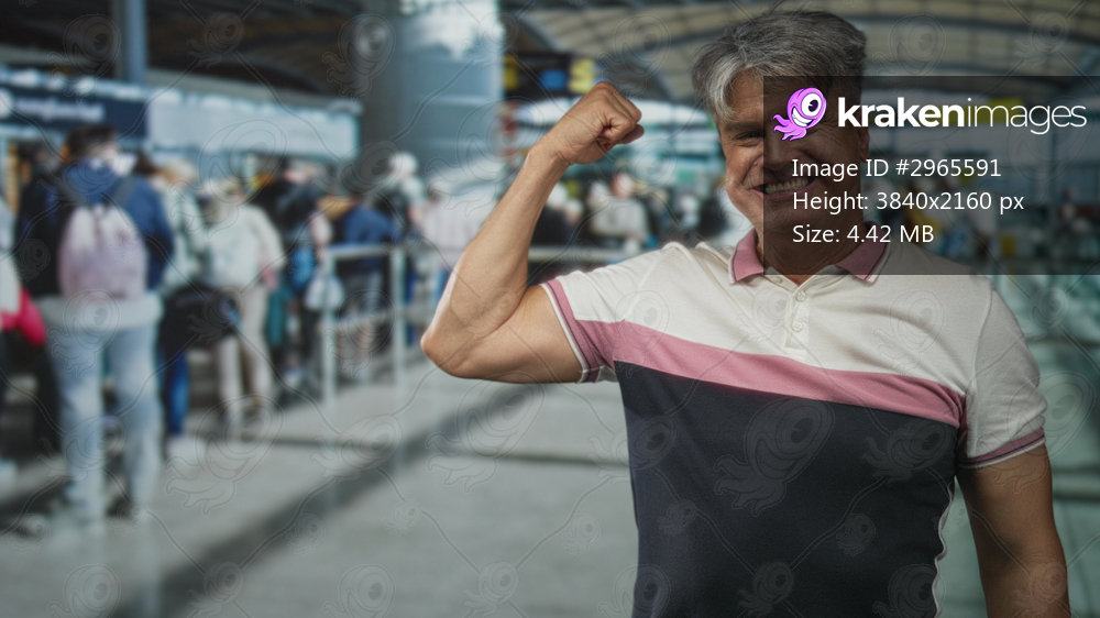 Middle-aged man flexes bicep and bares arm while grimacing in a crowded airport check-in queue, wearing a pink and navy polo shirt; frustration.
