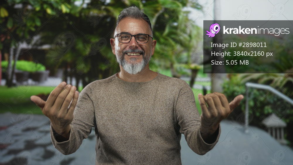Middle aged man with glasses and beard smiling, hands open, gesturing on a forest pathway in a park; friendly welcoming joy.