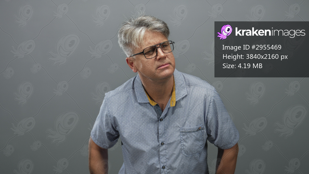 Middle aged man with glasses tilts head and squints, hands on hips in a studio; pensive quiet reflection.