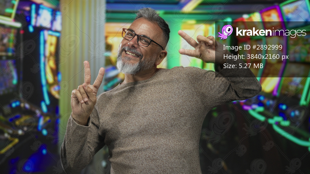 Middle aged man with gray beard and glasses showing peace sign with both hands at colorful casino slot machines, smiling widely and leaning slightly forward; joy celebration. - Kraken Images