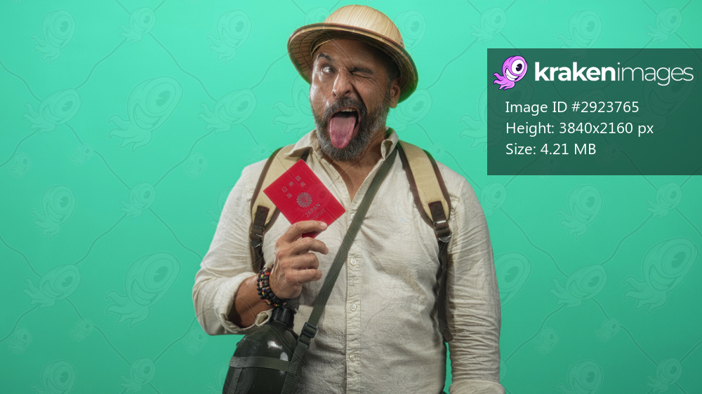 Middle aged man with gray beard holding a red passport and sticking out his tongue in a bright teal green studio; travel adventure playful.