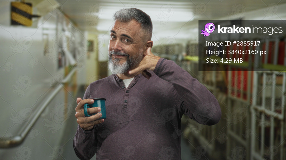 Middle aged man with grey beard holding blue enamel mug and making call gesture in building corridor while smiling; friendly casual playful.