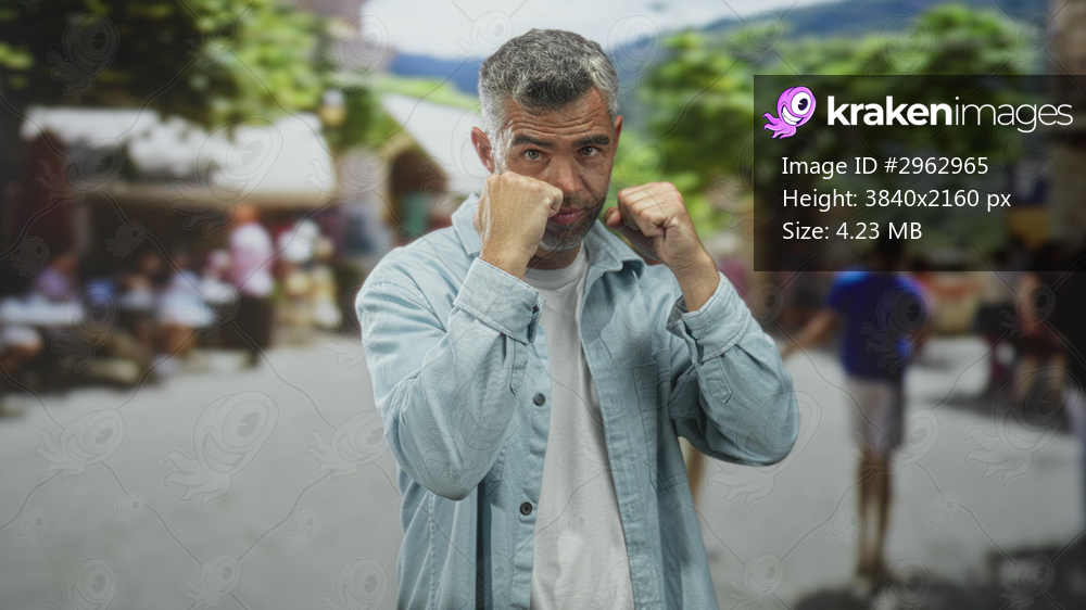 Middle aged man with grey hair and fists raised in fighting stance on a busy street market wearing light denim shirt and white tee; determination.