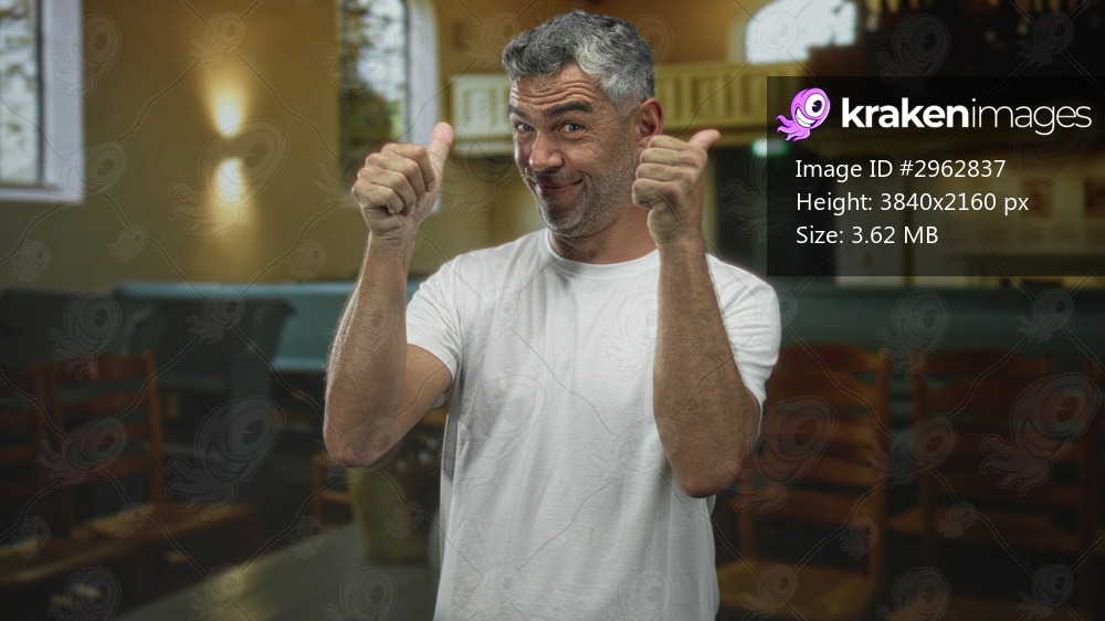 Middle aged man with grey hair gives both thumbs up wearing white tshirt in church nave among wooden pews; cheerful approval.