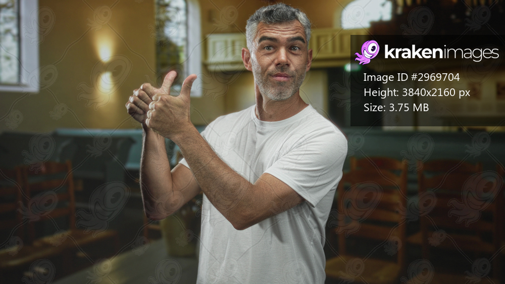 Middle aged man with grey hair gives both thumbs up wearing white tshirt in church nave among wooden pews; cheerful approval.