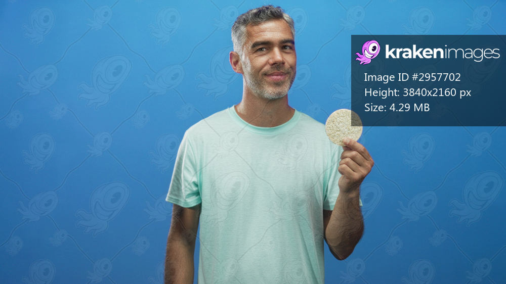 Middle aged man with grey hair wearing mint t shirt holding round corn pastry rice cake with right hand and smiling in studio blue backdrop; healthy snack contentment. - Kraken Images